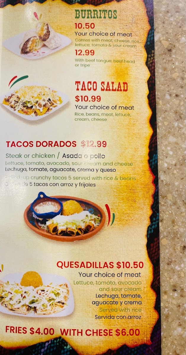 Lettuce, tomato, avocado, sour cream and cheese. Rolled up crunchy tacos 5 served with rice and beans. Asada. Lechugo, tomate, aguacate, crema y queso. Orden de 5 tacos con arroz y frijoles.